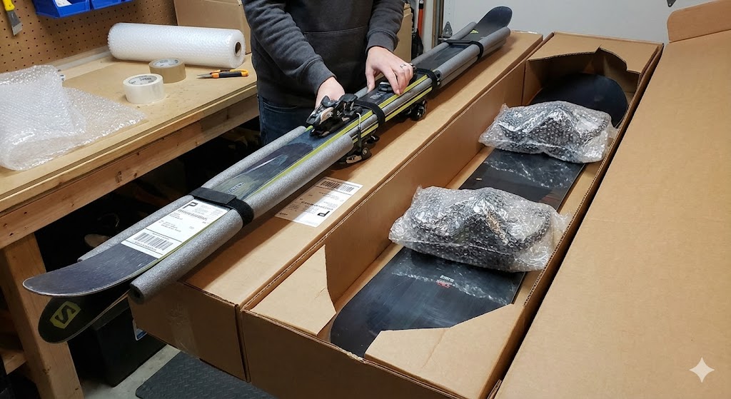 - Wypełnienie: Deska i narty nie mogą „latać” w kartonie. Puste przestrzenie na dziobie i ogonie (tail/nose) wypełnij zgniecionym papierem lub skropakiem. Dzioby nart potrafią jak włócznia przebić karton przy gwałtownym hamowaniu paczki na zjeżdżalni sortowniczej.