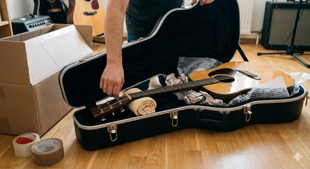 - Wypełnij puste przestrzenie w twardym futerale: Instrument nie może swobodnie poruszać się wewnątrz case’a (futerału). Wypełnij luki przy „rogach” pudła rezonansowego oraz wokół szyjki papierem lub pianką. W przypadku skrzypiec wyjmij mostek (podstawek) i zapakuj go osobno – nacisk z góry może wbić go w płytę wierzchnią.
