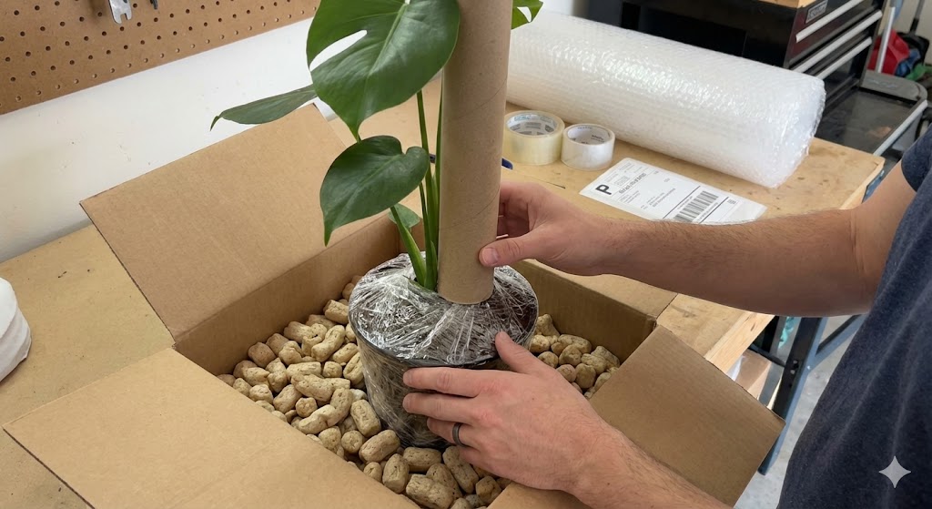 - Unieruchomienie w kartonie: Doniczka to najcięższy element przesyłki. Musisz przykleić ją mocną taśmą pakową bezpośrednio do dna lub bocznej ścianki kartonu wewnętrznego. Roślina nie może mieć ani centymetra luzu.